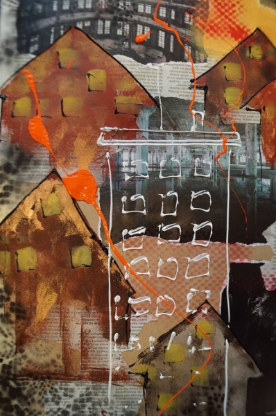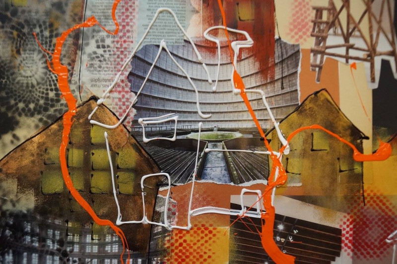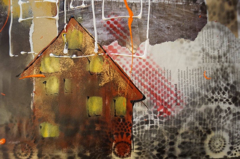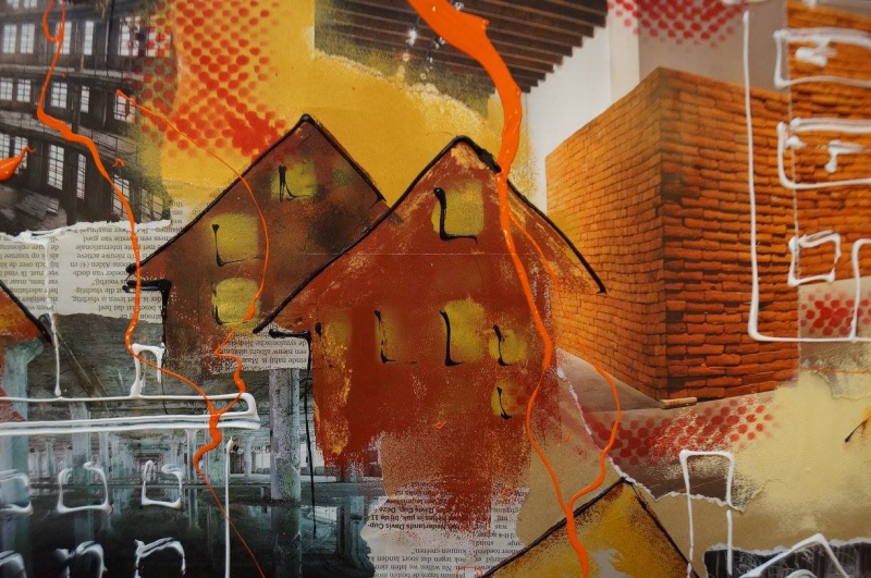 Binnen het thema ‘De Stad’ is vAnDre aan het scheuren, knippen, plakken, verven, spuiten, schilderen en smijten gegaan, met papier, verf, spuitbussen, rollers, tubes en wat al niet meer. Zo heeft hij zich heerlijk uitgeleefd en kwam hij tot dit resultaat.