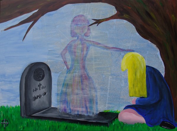 Oktober 2010 (80-60 cm; collagetechniek: acrylverf en kranten) Dit doek heeft ook collagetechniek in zich. Tekst-knipsels op de achtergrond moeten de herinneringen symboliseren.