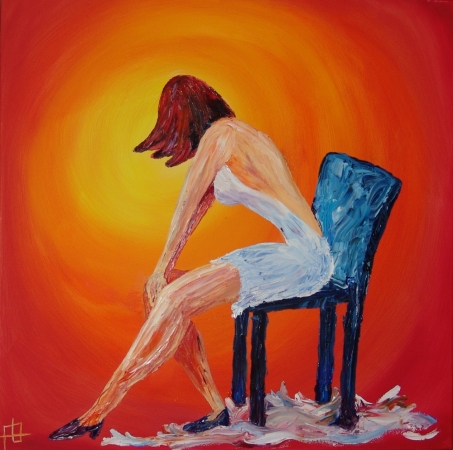 November 2008 (50-50 cm; olieverf & schildersmes) Na een tweetal schilderijen van strakke gebouwen, wilde ik het schildersmes eens uitproberen. Geen strakke vormen van gebouwen of wilde vormen van landschap, maar een mens. Het was even wennen, maar voelde goed. Lekker dik werken. Heerlijk mengen met kleuren. Na een vluchtig schetsje op papier heb ik alles rechtstreeks op het doek gedaan. Zonder veel voorwerk, gelijk naar een einddoel. Het schilderij was ruim binnen drie uur klaar. Lekker expressief. De vrouwfiguur is klaar met haar optreden (haar leven?). Ze ontdoet zich van haar theater-kleding en wacht geduldig voor de tunnel van licht…
