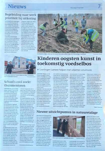 Samen met basisschool kinderen maken we een ‘beeld’ voor de tuin van het woonzorgcentrum De Uiterton in Lelystad. Het hout hiervoor hebben de leerlingen, samen met de boswachter, ‘geoogst’ in het toekomstige voedselbos. Door een corona-test kon ik zelf helaas niet mee, dus maakte ik vlug een schetsje voor de leerkracht, zodat de groep ongeveer wist welke vormen hout we zoeken. Een krabbeltje van niks, op de achterkant van een envelop. Wie schetst mijn verbazing dat die krabbel even later online staat bij het artikel van de Flevopost. Hoe gaaf is dat. Ha ha.