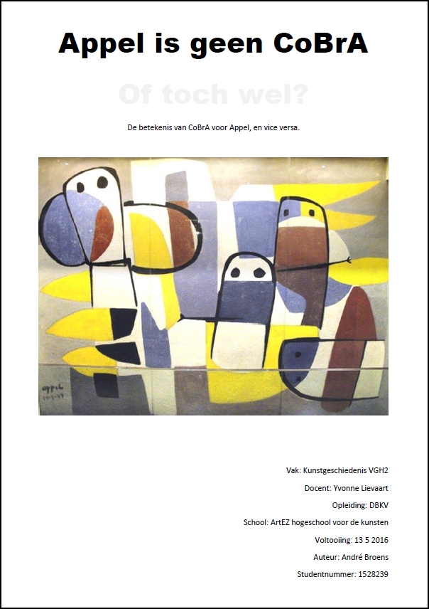 Appel is geen CoBRa 2016 Of toch wel? Hier wordt onderzocht wat de betekenis van CoBrA is voor Appel, en vice versa. André maakte dit literatuuronderzoek in de tweede helft van het eerste jaar van de Kunstacademie (2016). Cijfer: 8. Gerelateerde berichten:Gruis, Jeroen Bosch en Bill ViolaFelicitatie-kaartStillevens in houtskoolWerkschouw januari 2017Workshop voor jouAlle video'sStageTijdgeest Money (Eindpresentatie Hedendaagse kunst) - Vlog vAnDré #8