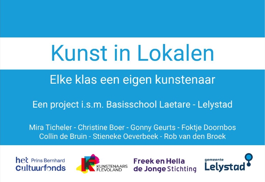 Kunst in Lokalen is een nieuw project van Kunstenaars Flevoland, in samenwerking met basisschool Laetare in Lelystad. Laetare heeft zeven klassen. Aan elke klas hebben we een kunstenaar gekoppeld. Er doen aan dit project dus zeven kunstenaars mee. De kunstenaars komen tijdens het projectjaar vier keer in de klas. Ze nemen steeds een kunstwerk mee. Ze vertellen over zichzelf en over hun beroep én over het kunstwerk dat ze hebben meegenomen. Ook geven ze vier keer een opdracht, een opdracht die samenhangt met het kunstwerk.