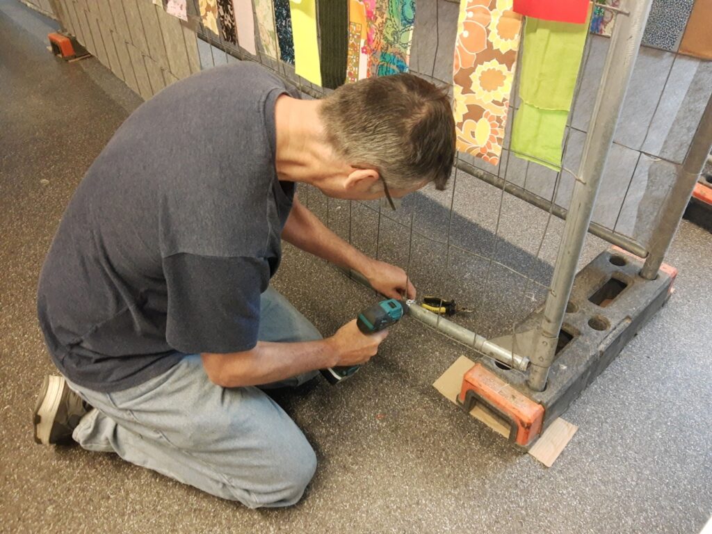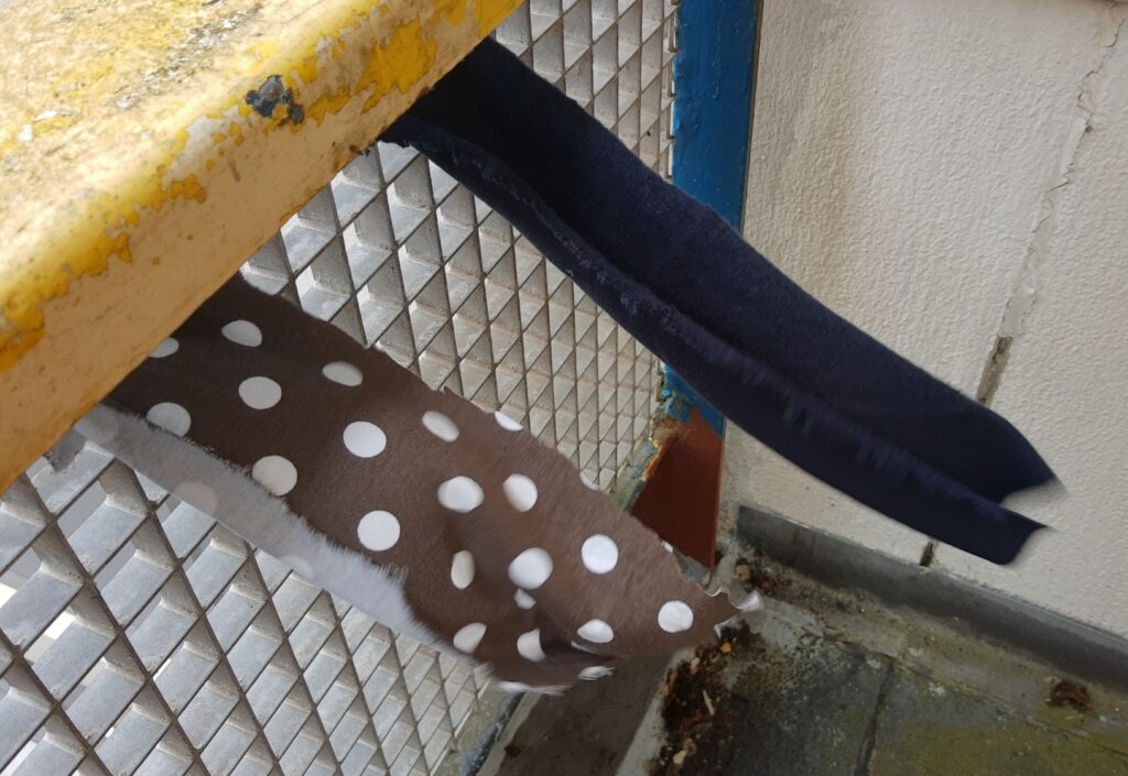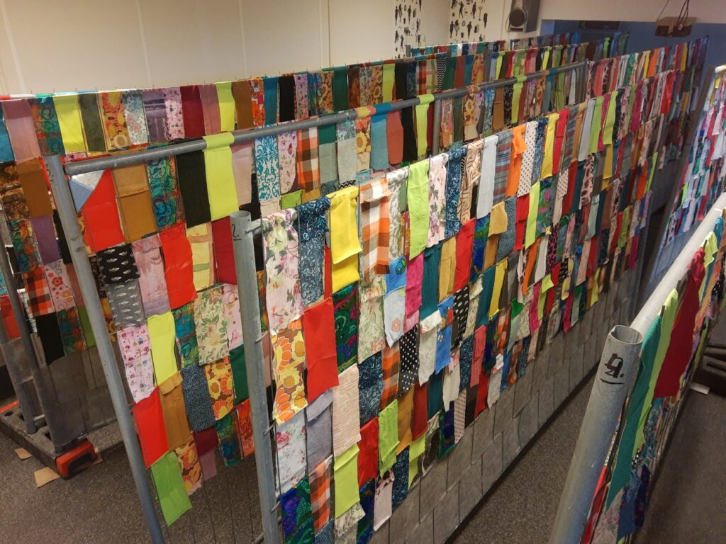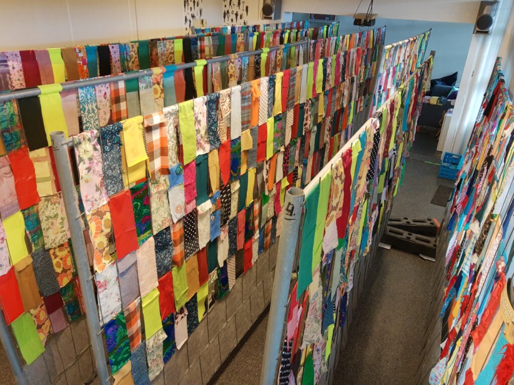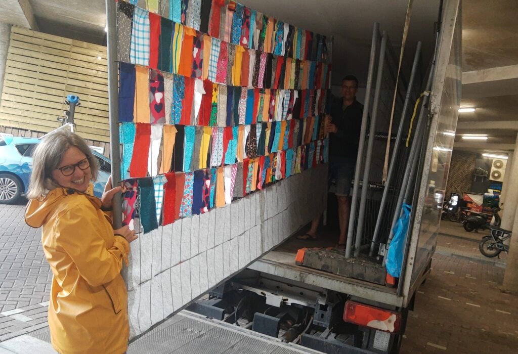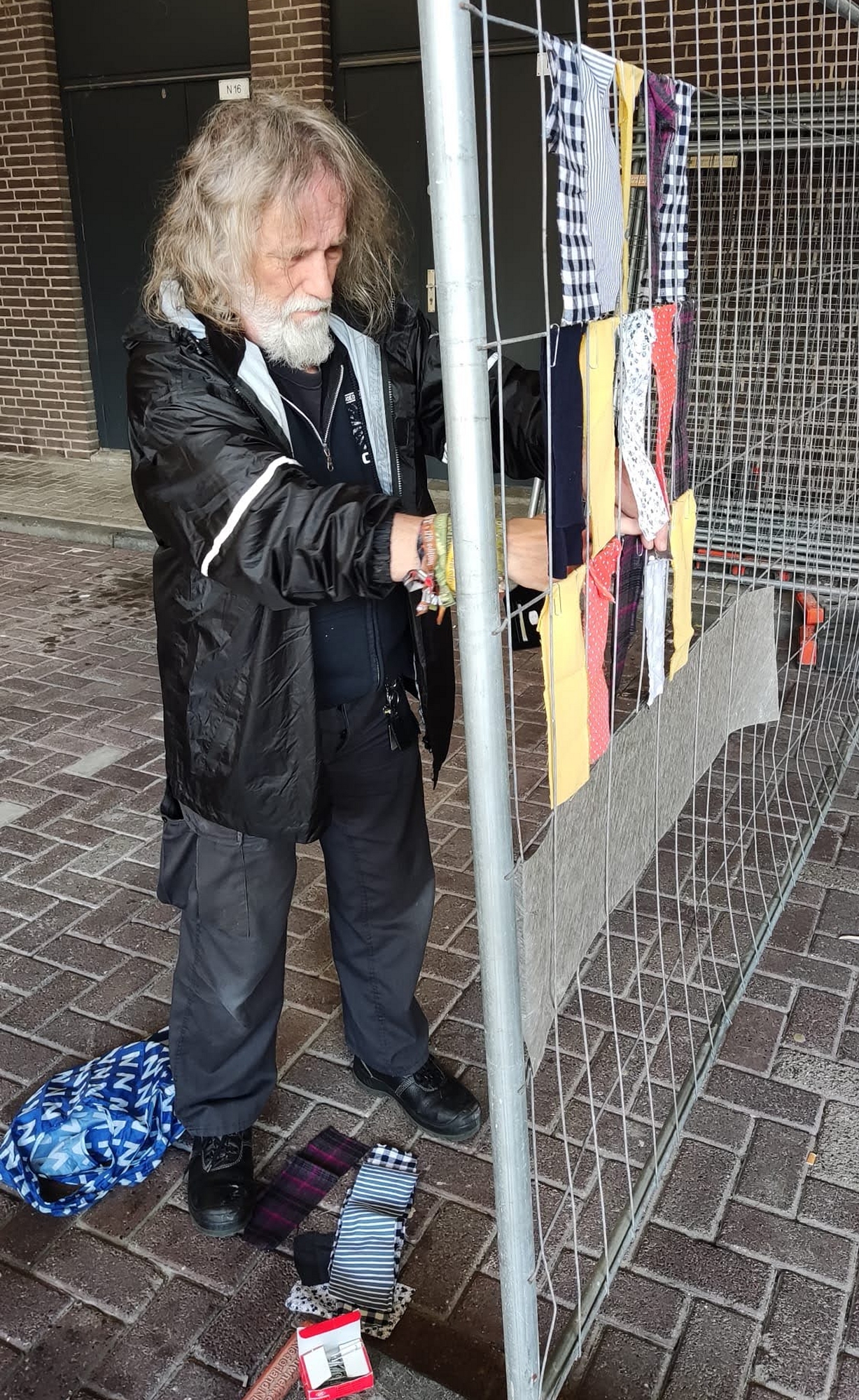 Voor het indienen van het ontwerp is er al flink gestoeid met het hek en de lapjes. In deze fase zijn de ‘lapjes’vlaggetjes’ nog met een paperclip bevestigd aan het hek.