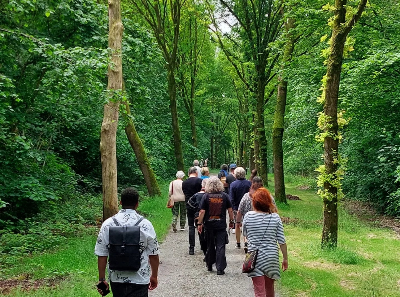 Met de kunstenaars die werk leveren voor het NatuurKunstPark, lopen we de route en zoeken we een goede plek voor ieders werk. Ik vind ‘mijn plek’ aan het water, tegenover het restaurant. Een lekker grote plek voor een groot werk.