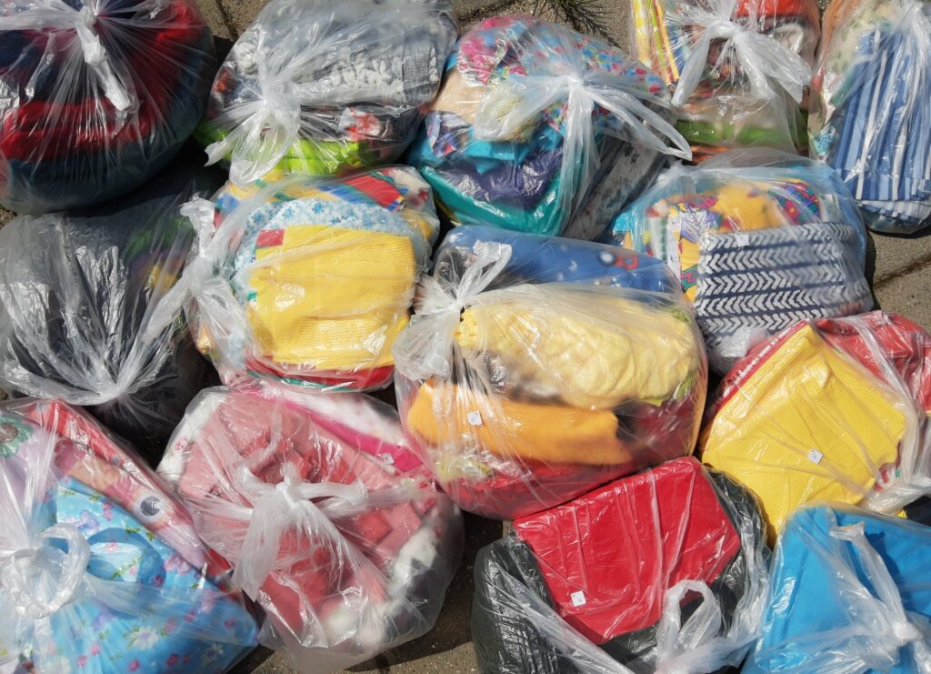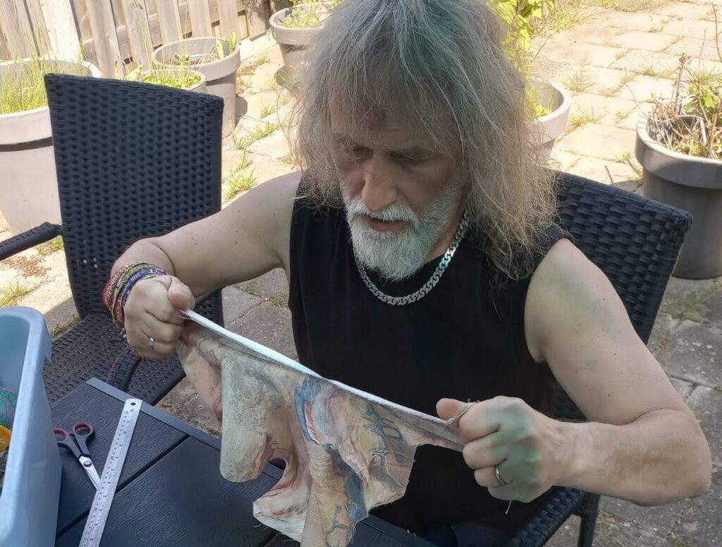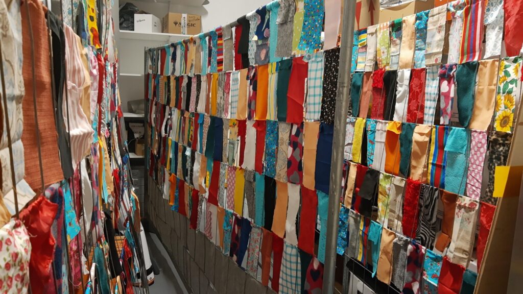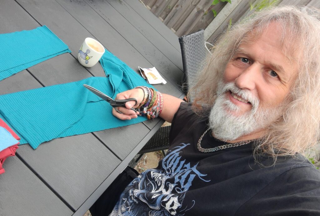 Natuurlijk hebben we zelf wat lapjes om te gebruiken. Maar dankzij verzoeken die onze dochter Anoek doet op internet hebben we binnen korte tijd meerdere pakketten met diverse lappen stof. Nu blijkt ook dat katoen het handigst is. Dat is goed in repen te scheuren, waardoor je al een mooie rand krijgt. Stretchstof moet je helemaal knippen en daarna begint het heftig te krullen, waardoor het eigenlijk niet te gebruiken is.