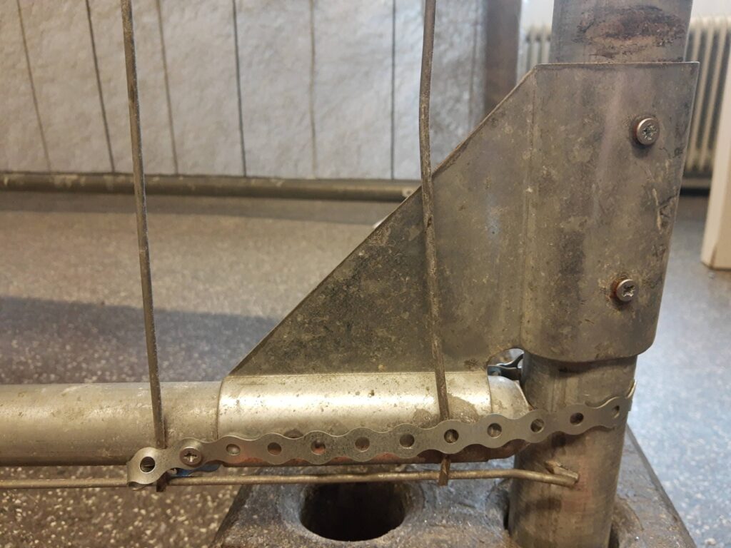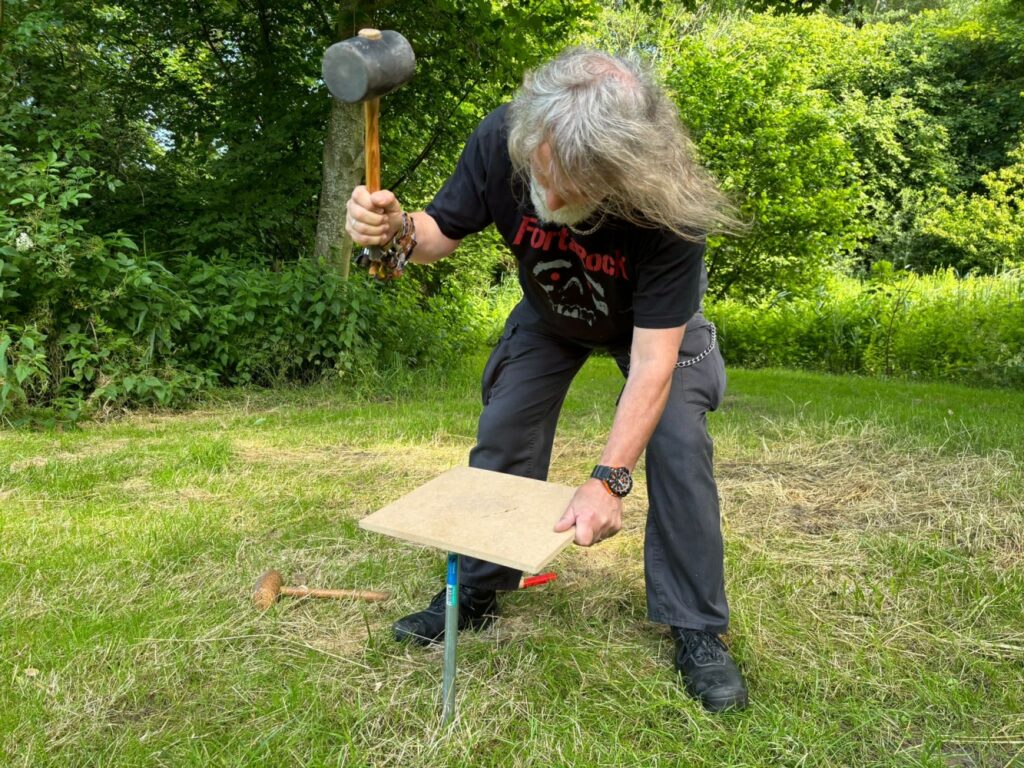 Als de hekken klaar zijn en alle lapjes hangen, dan moet nog gekeken worden hoe de hekken het best blijven staan. De betonnen voeten zijn erg storend, dus moet en stalen buizen de grond in geslagen worden, waar de palen omheen gaan. Gelukkig dat het allemaal relatief soepel de grond in. Natuurlijk worden de hekken ook aan elkaar vastgeklemd.