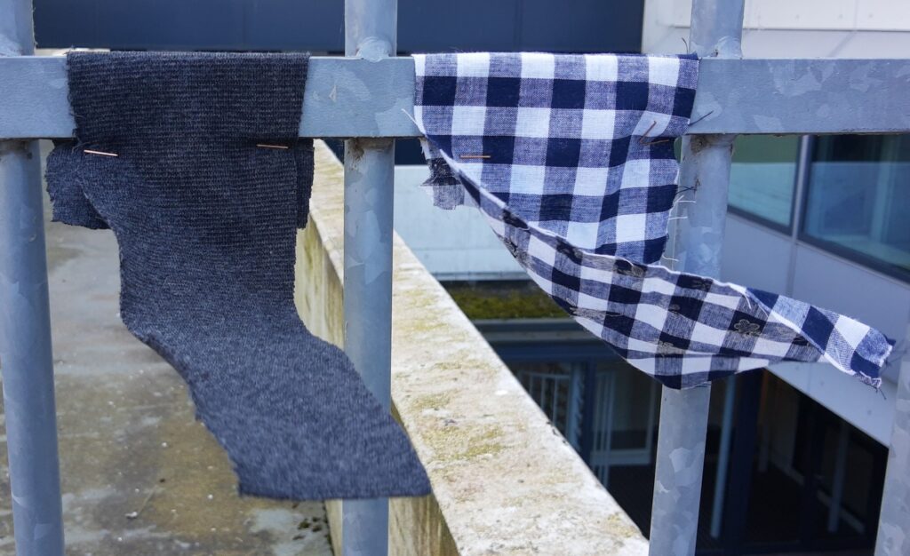 Op een aantal plekken in Lelystad zijn ‘vlaggetjes’ opgehangen, om te ontdekken wat het weer (wind en regen) doet met de stof en de nietjes.
