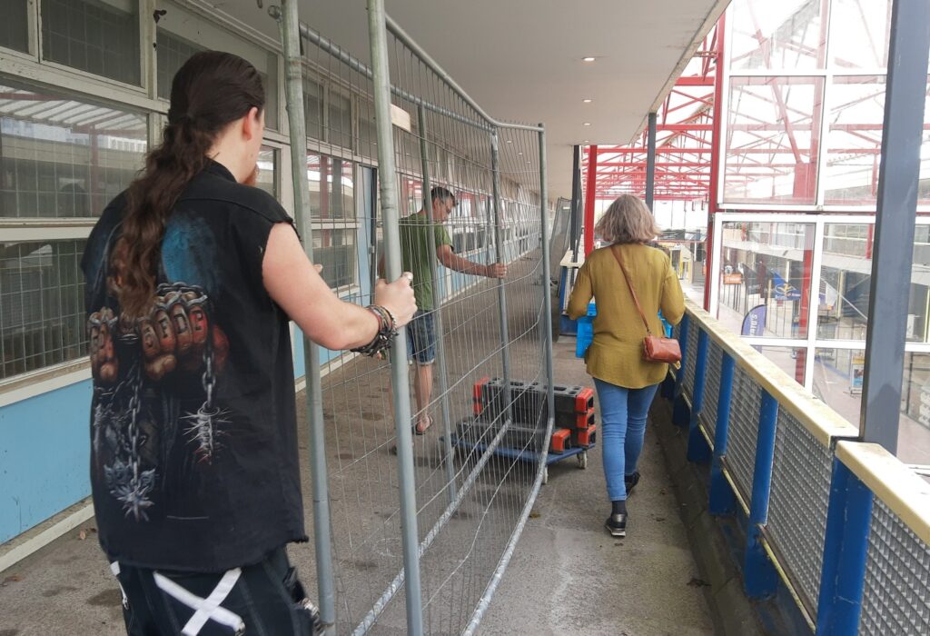Dan gaat het ophangwerk beginnen. Onze dochter Anoek helpt mee. We mogen het magazijn van The Wizards gebruiken om de eerste hekken te vullen. The Wizards (Pool & Dartcentrum Lelystad) heeft de tien hekwerken en de bijbehorende stenen voeten gesponsord.