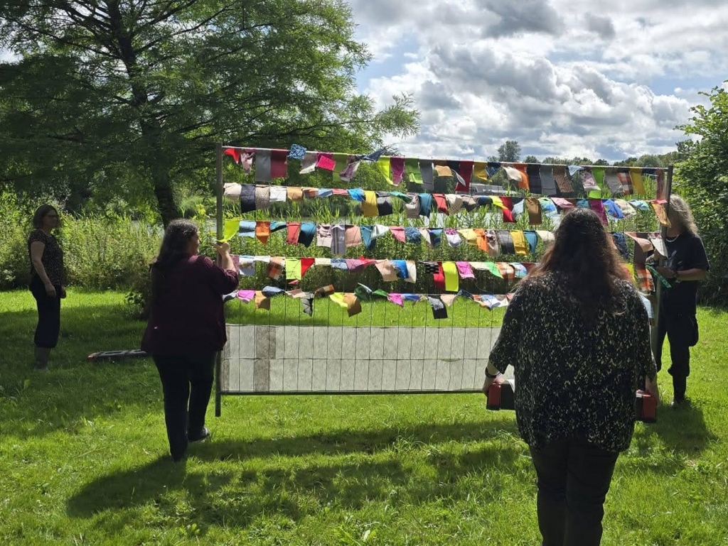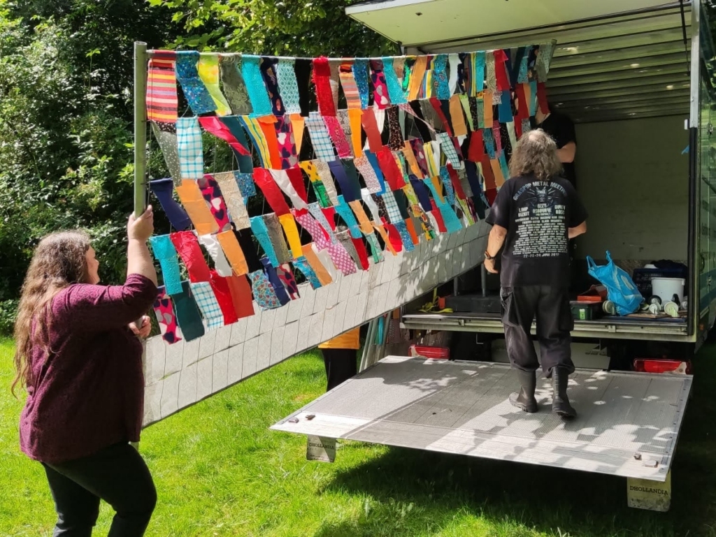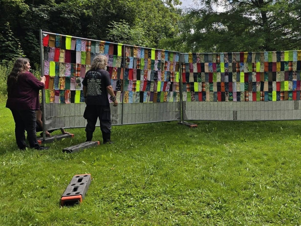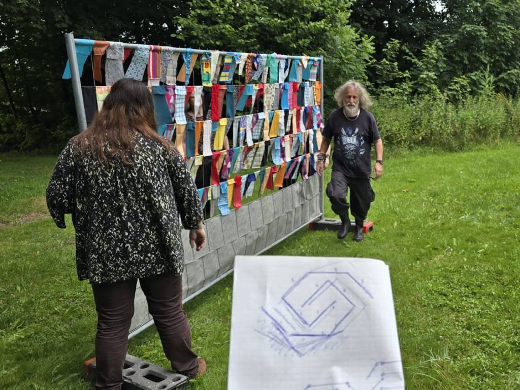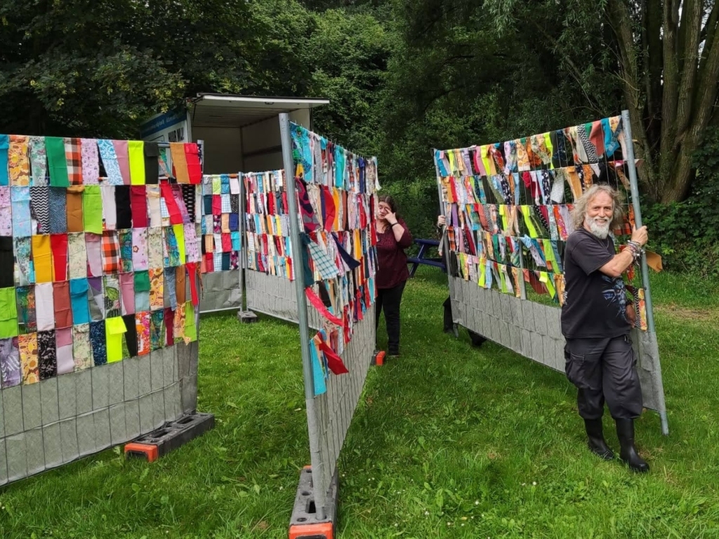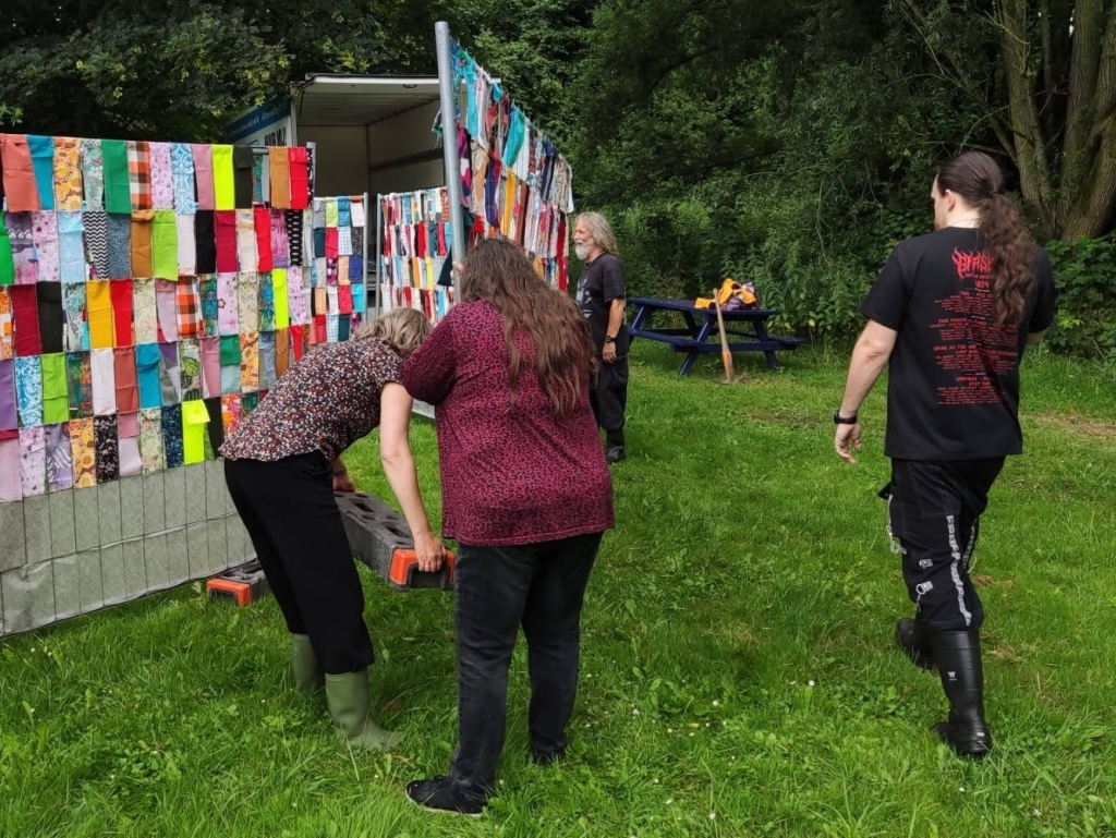 De hekken worden uit de auto gehaald en in de betonblokken ongeveer op de plek gezet. Beginpunt is de uitlijning langs de oever en de plek van de boom.