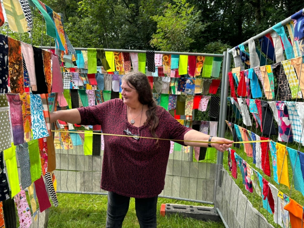 Als alles staat, komt de precieze plaatsing. Dit gebeurt vanuit het midden. De twee slierten van hekken krullen in elkaar, dus dat moet overal met gelijke afstand verlopen.