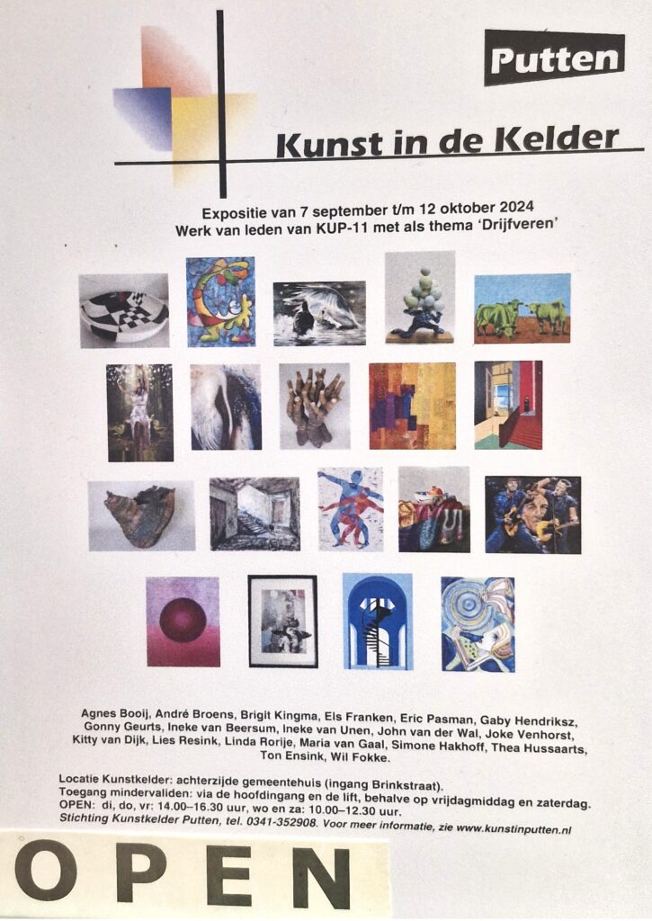 Op 5 september 2024 konden alle leden van KUP-11 (en enkele gast-kunstenaars) hun werken inleveren voor de expositie in de Kunstkelder in Putten. De Kunstkelder zit in een voormalige bunker, onder het stadhuis.