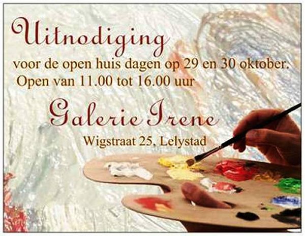Galerie Irene (okt.2011) 2011 In het weekend van 29 en 30 oktober 2011 hield Galerie Irene wederom een Open Weekend. Gerelateerde berichten:Installatie Kubus"Ik TOON" in stadhuisKunst Route LelystadTour of Art 2022Atelierroute Lelystad 2009Zomer-Expo in Cultuurhuis, ZwolleA Touch Of Art 2008Atelierroute Lelystad 2014 (deelnemers expo)
