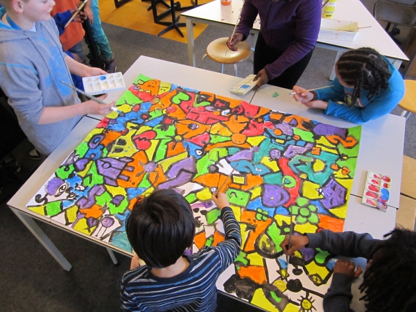 Bij elk vel stonden ongeveer 9 kinderen te schilderen.