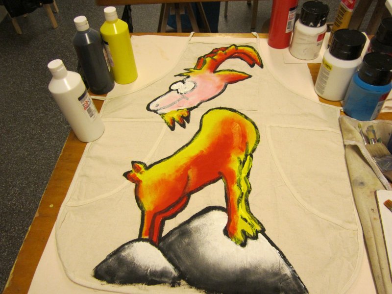 Steenbok-schort (VERKOCHT) 2014 André heeft één van zijn schilderijen op een schort geschilderd. Helemaal echt, met roller, spuitbus en witte lijn. Natuurlijk helemaal kleurbestendig, gefixeerd en wasbaar. Gerelateerde berichten:AvondwandelingBalloons (VERKOCHT)DoodlopendDrummer (VERKOCHT)KoeienZonder naam 1The Blue CatViking (VERKOCHT)