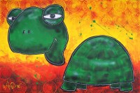 Hij maakte gedichten voor zijn schilderijen en las die voor. En hij maakte grapjes bij zijn werk, zoals de trage schildpad die weg racete. En de vogels die wormen pikten.