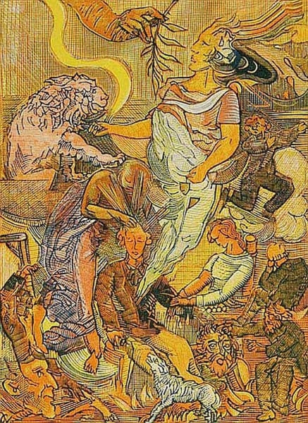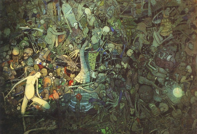 Op de rijk beschilderde vellen en doeken staan duivels, boze dwergen en geesten naast de klassieke christelijke motieven en verwijzingen naar het hindoeïsme en andere Oosterse filosofische richtingen: iets wat op het eerste blik onbegrijpelijk lijkt, maar dat bij nader inzien in overeenstemming staat met de levensbeschouwing en de kunstopvatting van Josef Váchal.